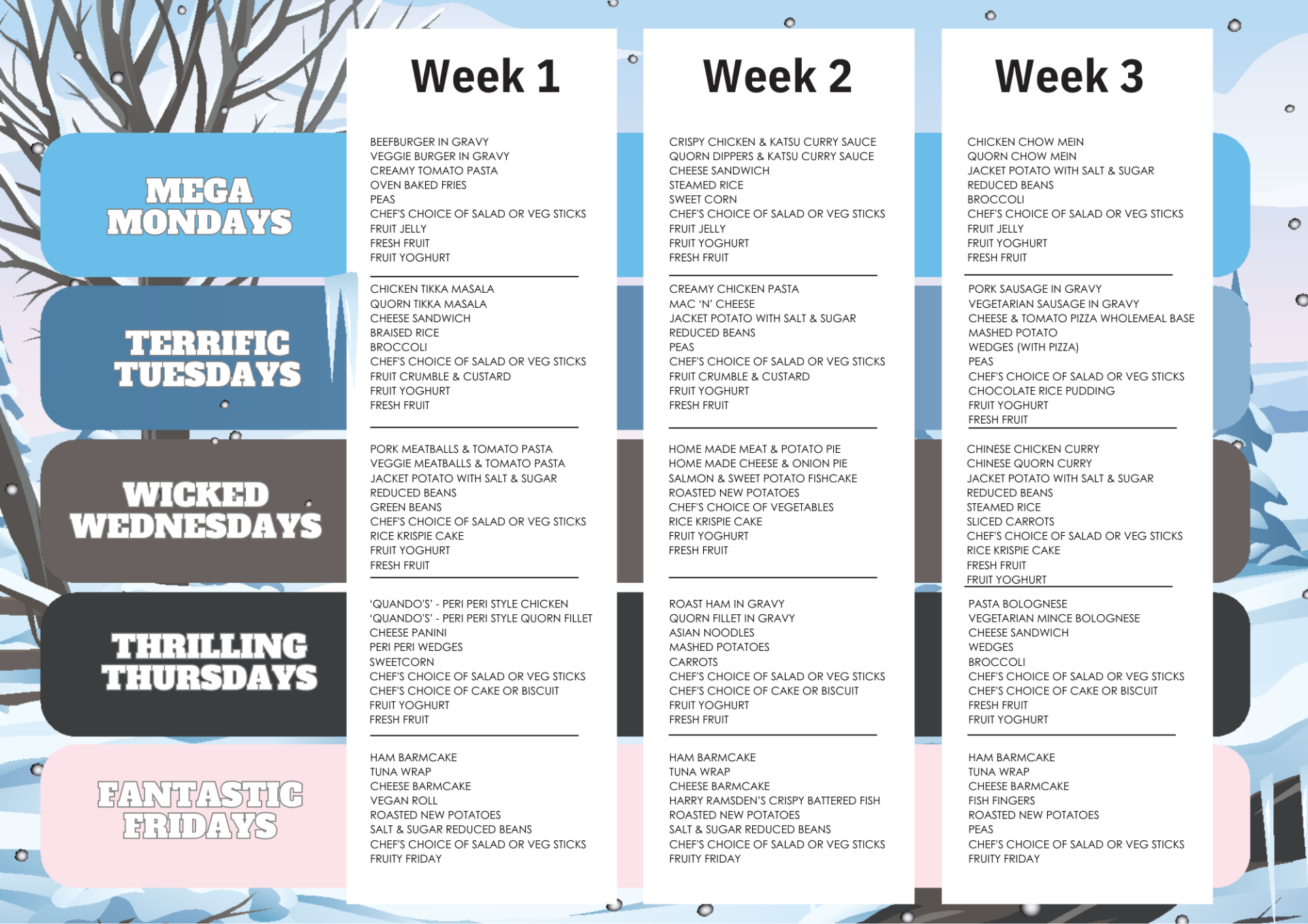 If your child has a school meal they have a choice of menu, which includes a vegetarian option. The standard menu features: